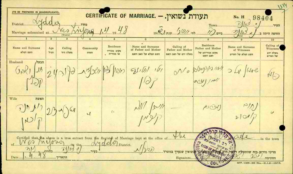 1.4.1948 Heirat mit Siegfried Kaplan in Nesiwona, Lydda