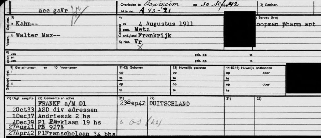 13.2. 1939 Anmeldung von Werner Kahn in Amsterdam; diverse Adressen, zuletzt bei Hirschfeld in der Roerstraat 20