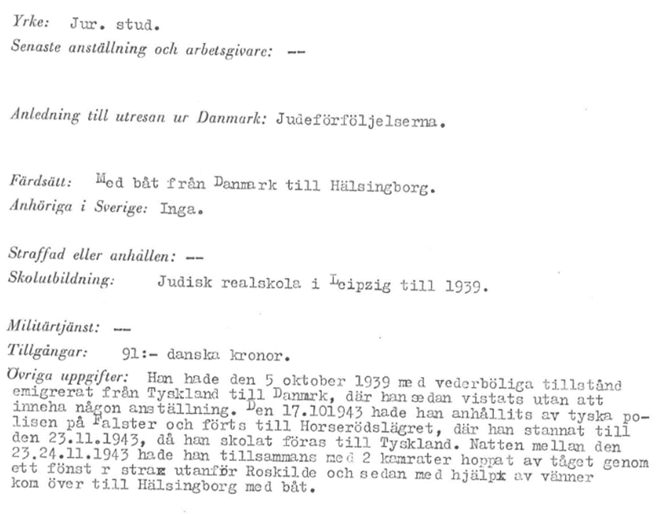 23./24.11.1943 Flucht mit zwei Chaluzim durch Sprung von einem Dach; mit Hilfe kommen sie von Falster nach Roskilde