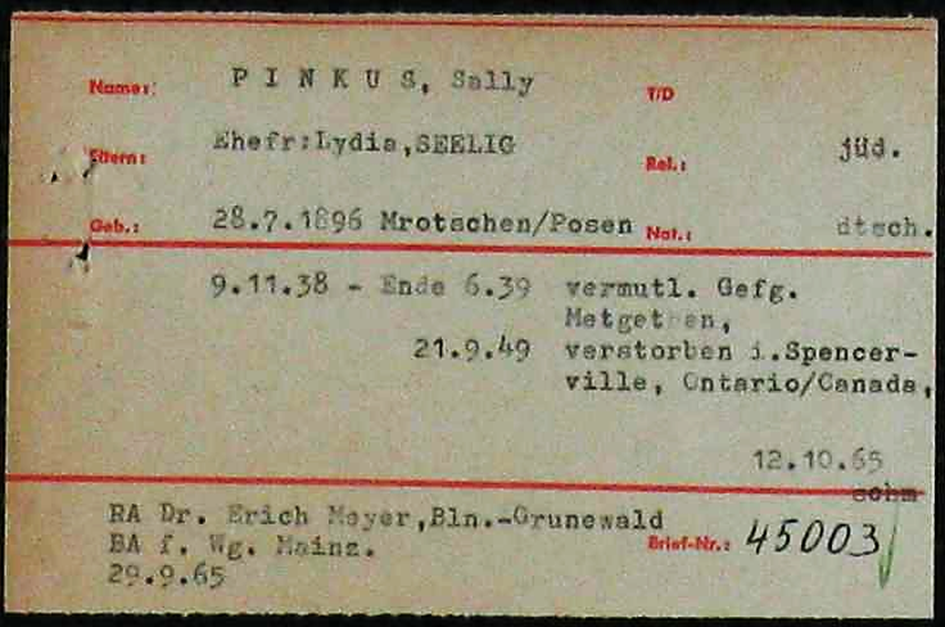 Vater Sally Pinkus *28.7.1896 in Mrotschen; ✡21.9.1949 Spencerville Ontario