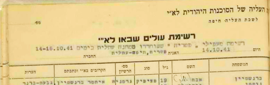 25.11.1940 Internierung in einer Lagerhalle im Hafen von Haifa; die von Bord gesprungenen werden in die Arrestzellen der Polizeiwache von Haifa; Serie von Verhören, insbesondere wenn sie von den Briten der Zugehörigkeit zur Haganah verdächtigt wurden.