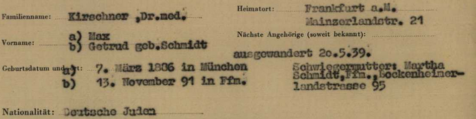 20.5.1939 Familie Kirschner abgemeldet in Frankfurt zur Emigration nach England