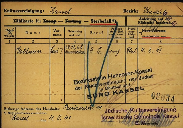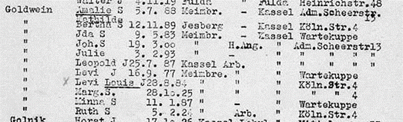 8.12.1941 Mutter aus Kassel, Admiral-Scheer-Straße 13 mit 12 Mitgliedern der Familie Goldwein über Nacht im Sammellager Turnhalle Wörthschule, Schillerstraße