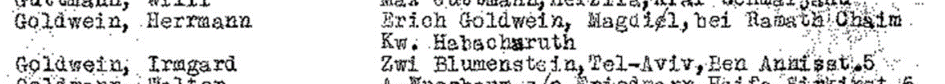 14.2.1940 Registrierung von Hermann Goldwein in Athlit; sie gibt den Lehrer Herbold Löwenstein als Referenz an, als Gemeindeältesten Rabbi Jakob Trauenberg, beide Meimbressen (Dokument D/717/40/CHU);