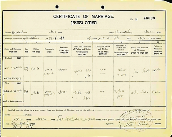 Heirat 26.1.1941 Taube Joanna Gutstein *12.2.1911 in Dolina; ✡22.11.1988 Haifa