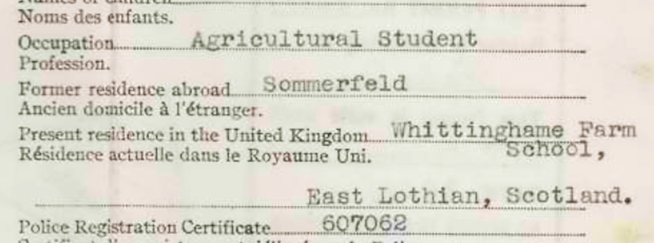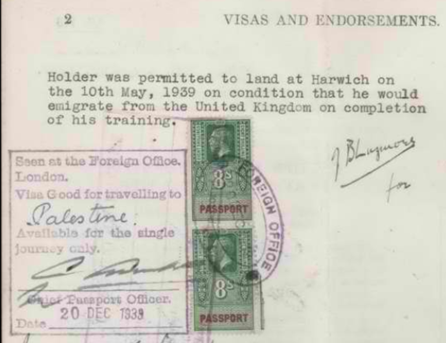 10.5.1939 Ankunft in Harwich mit „permit“ für die Fortsetzung seiner Aubildung in der Whittingehame Farm-School, nahe der Ortschaft Stenton, East Lothian Schottland