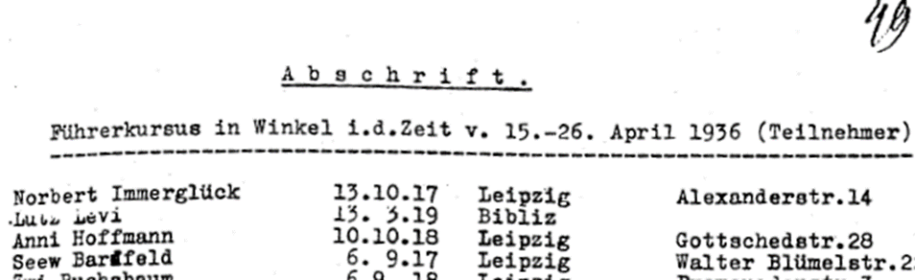 Lutz Levy auf der Gestapoliste des vom Makkabi Hazair im Gut Winkel ausgerichteten Führerkursus mit 64 Teilnehmern aus Deutschland