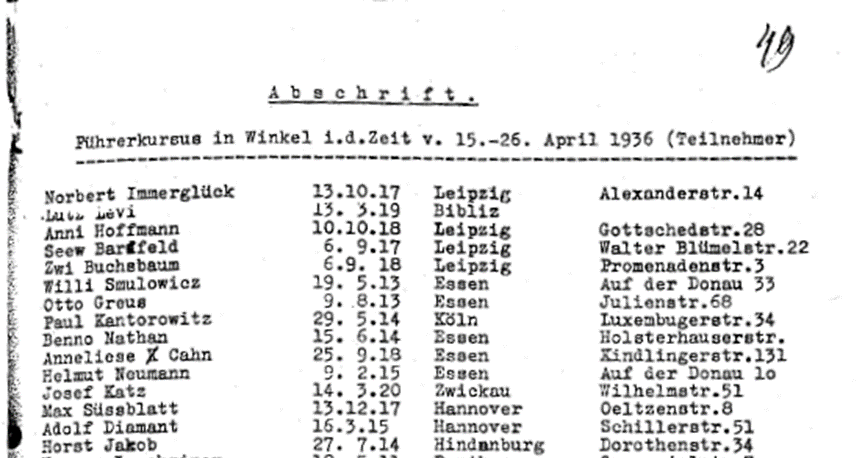 Horst Jacob auf der Gestapoliste des vom Makkabi Hazair im Gut Winkel ausgerichteten Führerkursus mit 64 Teilnehmern aus Deutschland