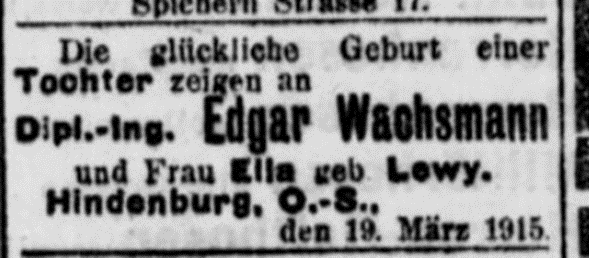 Edith Wachsmann *1.12.1918 in Hindenburg; oo 1941 Marc Holcman
