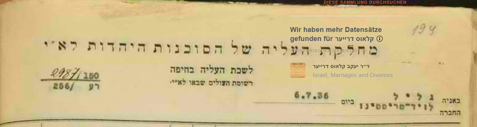 Heirat 1937 mit Klaus Dreyer *25.6.1909 in Köln; ✡4.1.1999 Ramat Gan