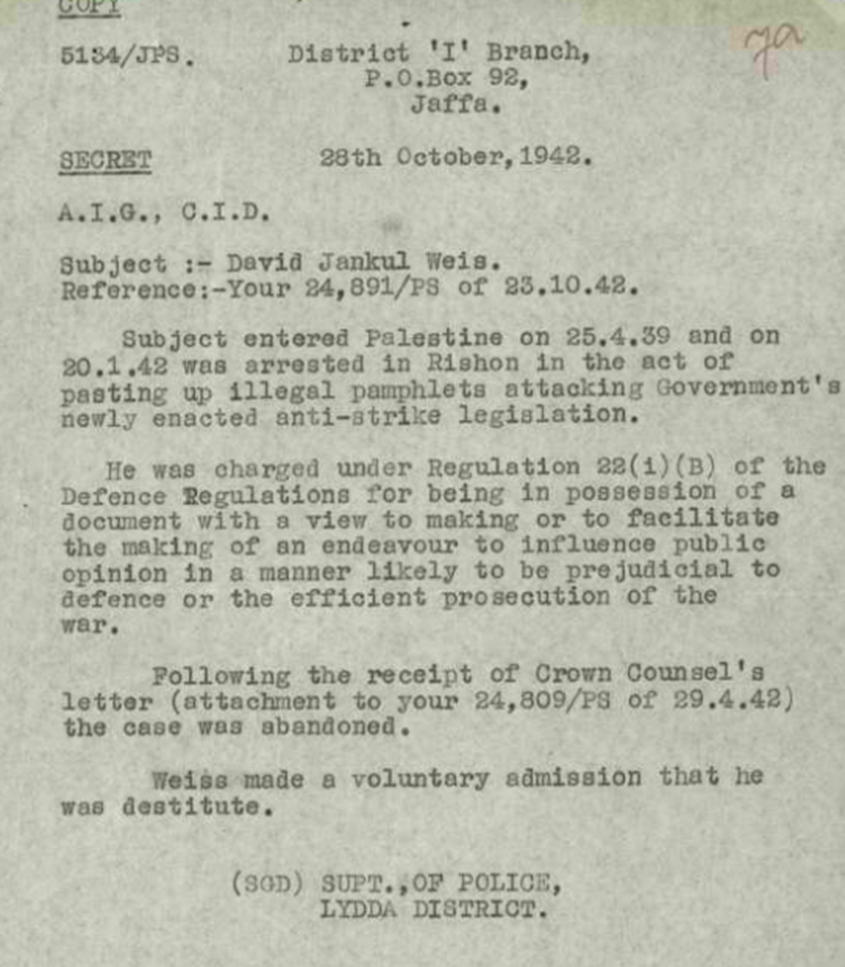 20.1.1942 David Weiss verhaftet wegen illegalem Plakateklebens gegen eine „Antistrike“ Verodnung der Mandatsbehörden;