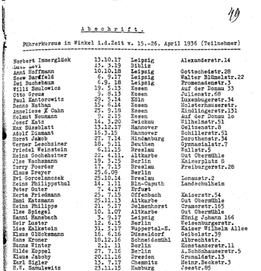 Karl Sigler auf der Gestapoliste des vom Makkabi Hazair im Gut Winkel ausgerichteten Führerkursus mit 64 Teilnehmern aus Deutschland
