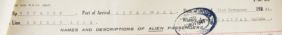 21.11.1941 Ankunft von Hans W. Samolewitz auf der SS ORCADES mit einer Gruppe von 17 jüdischen Flüchtlingen von Liverpool in Halifax
