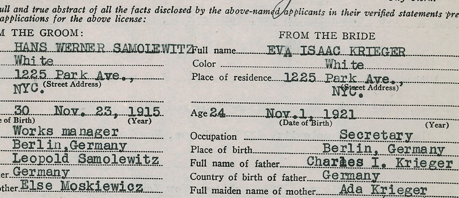 Heirat 15.5.1946 in Manhattan mit Eva Krieger *1.11.1921 in Berlin