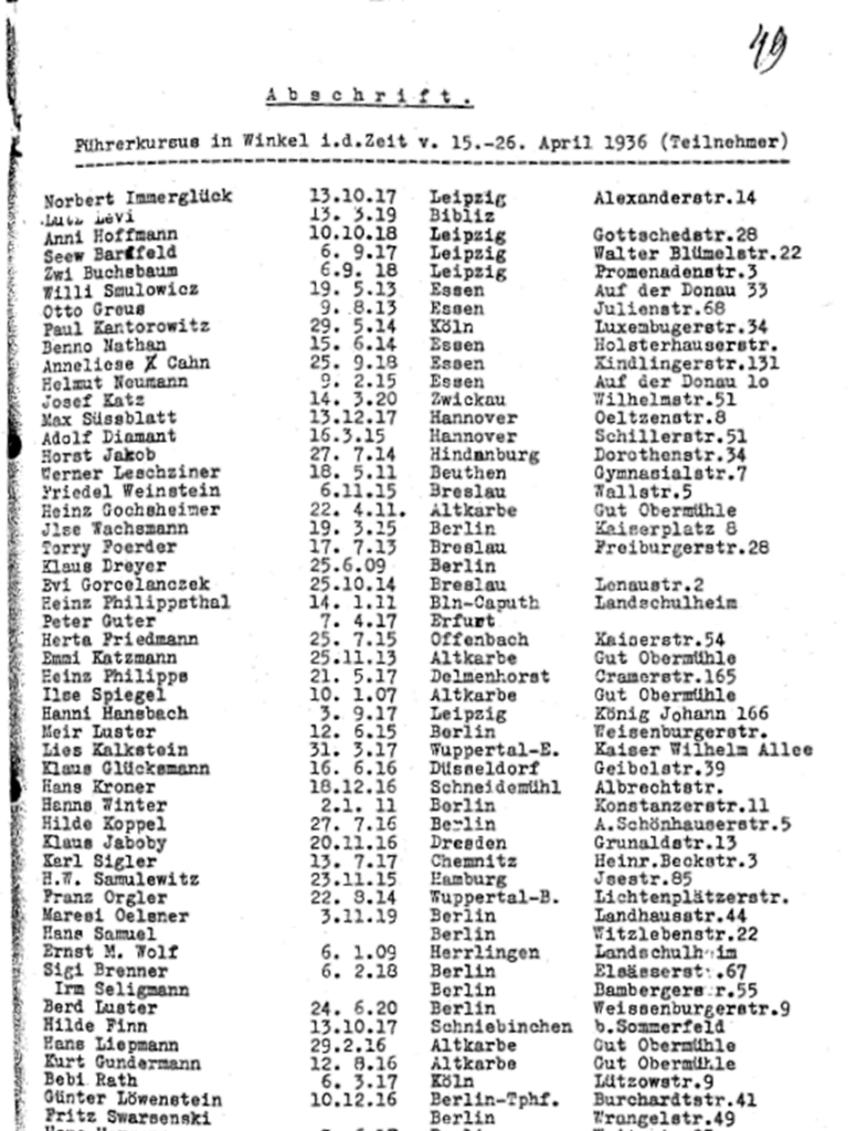 Fritz Swarsensky auf der Gestapoliste des vom Makkabi Hazair im Gut Winkel ausgerichteten Führerkursus mit 64 Teilnehmern aus Deutschland
