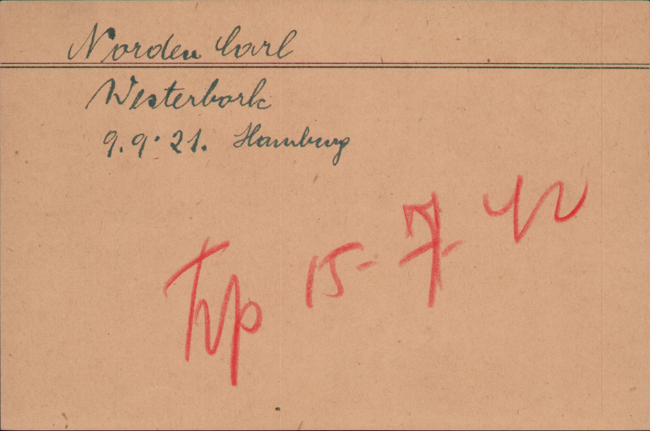 15.7.1942 Carl Norden im ersten Transport ab Westerbork nach Auschwitz; aus dem Lager waren hierfür 100 „Oude kampbewoner“ selektiert worden. In Unkenntnis der Gefahr vertrat der Hechaluz die Ansicht, die Chaluzim sollten sich für diesen ersten Transport freiwillig melden.