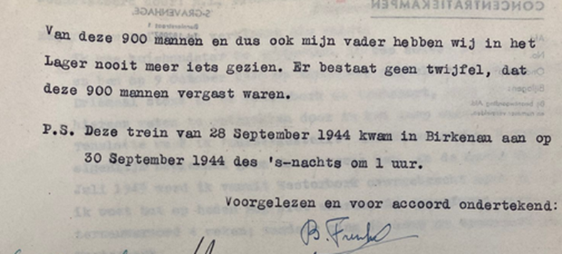 „Vor mir in der Reihe war mein Freund Bernhard Frenkel. Vor ihm stand sein Vater. Wir wurden angewiesen, sobald wir zu dem SS-Offizier kämen, unser Alter und Beruf angeben müssten. Ich höre noch Herrn Frenkel sein Alter (in den Fünfzigern) und seinen Beruf „Kaufmann“ sage. Der arme Mann war nur etwa 1,58 Meter groß und wurde zur rechten Seite geführt.Bernhard gab sein Alter von achtzehn an und „Autoschlosser“ und wurde nach links gewiesen.“
