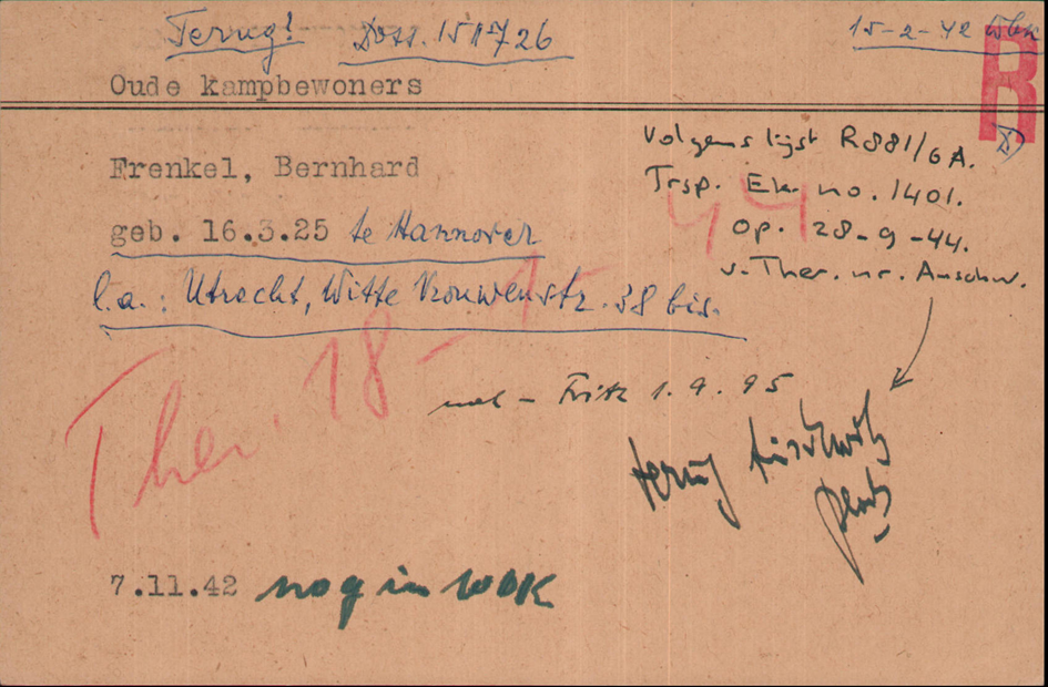 Februar 1942 Bernhard verhaftet wegen Verteilen illegaler Abschriften von Sendung der BBC und Radio Oranje; der er trotz Schlägen nicht aussagt werden er und seine Eltern in das Kamp Westerbork eingewiesen.