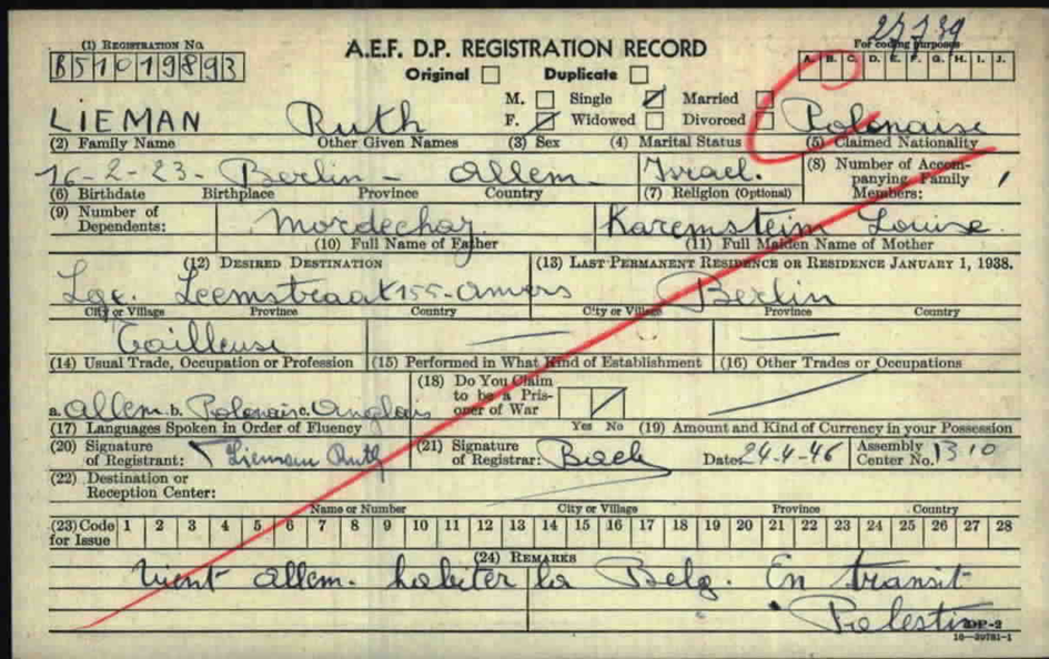 24.4.1946 im DP-Assembly Center 1310; will über Belgien nach Palästina