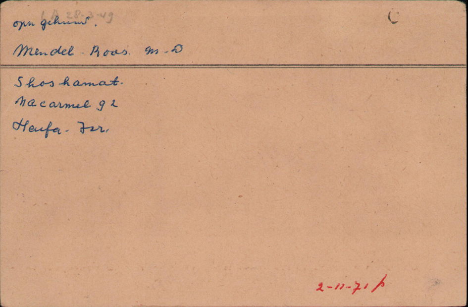 „Opn. Opnieuw gehuwt“, Mendel Roos M.D.; Shoshamat, MaCarmel 92 in Haifa