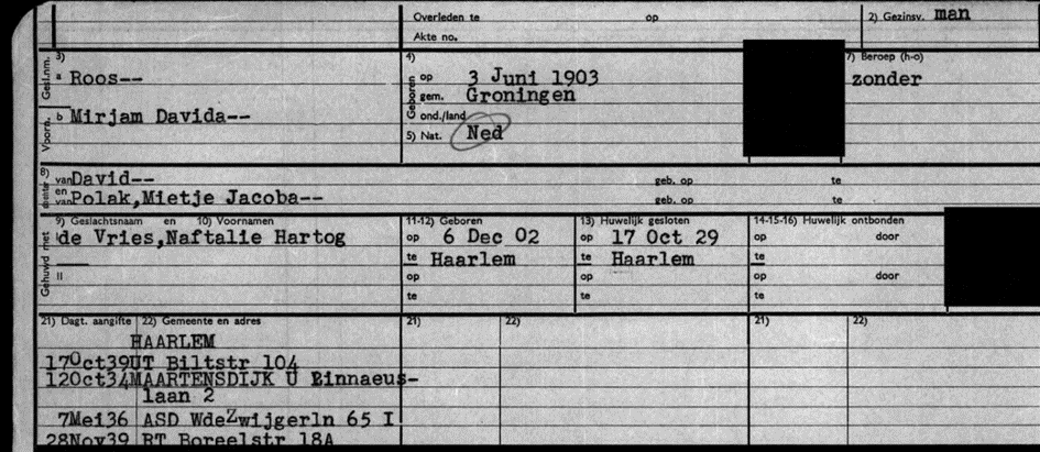 29. 3.1950 heiratet Mirjam Davida Roos verw. de Vries in Haarlem Ernst Mendel Mirjam Davida Roos verw. de Vries