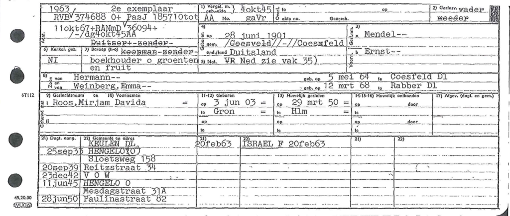 20.2.1963 abgemeldet aus Hengelo zur Auswanderung nach Israel