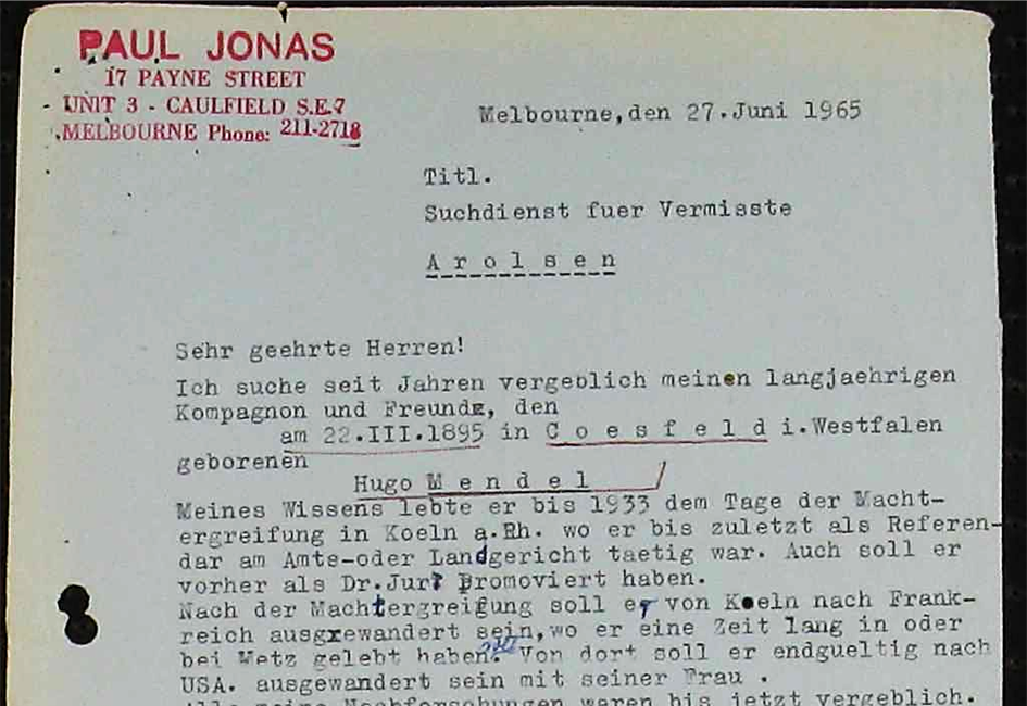 1965 wiederholte Arolsen-Suchanfragen von Hugo Mendels Kompagnon und Freund aus Borken Paul Jonas, die aber ergebnislos verlaufen.