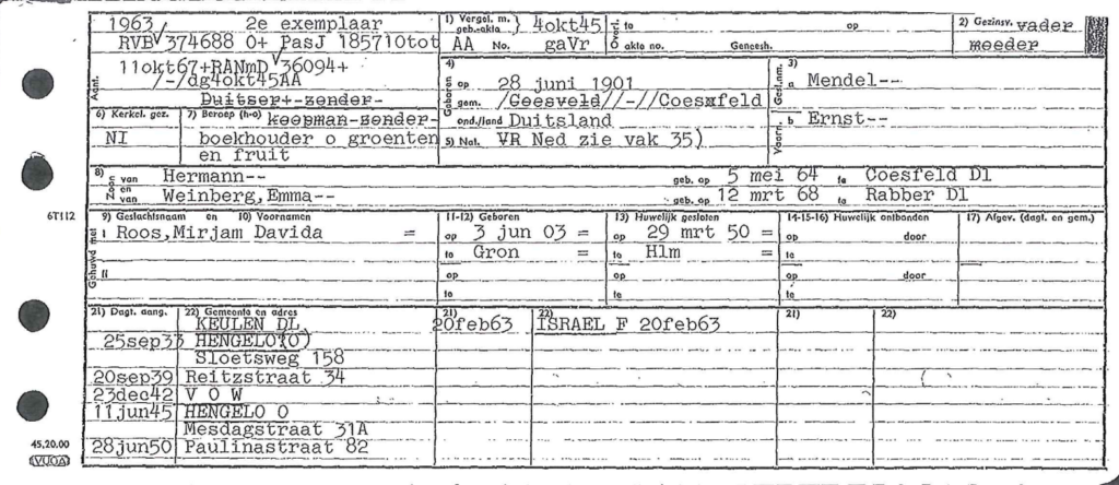 23.12.1942 registriert als VOW „vertrokken onbekend waarhen“; dies war die Standard-Notiz für „onderduiker“; derselbe Eintrag bei seiner Schwester Adele und Mann Julius