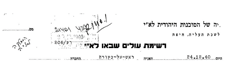 24.12.1940 Einreise in Rash el Naqura Palästina mit einem Studentenzertifikat der Jugendalija der Kategorie B(III); die Einreise über den libanesischen Grenzort Naqura spricht dafür, dass die Gruppe Palästina auf dem Landweg über die Sowjetunion, Odess, Türkei, Syrien erreichte.