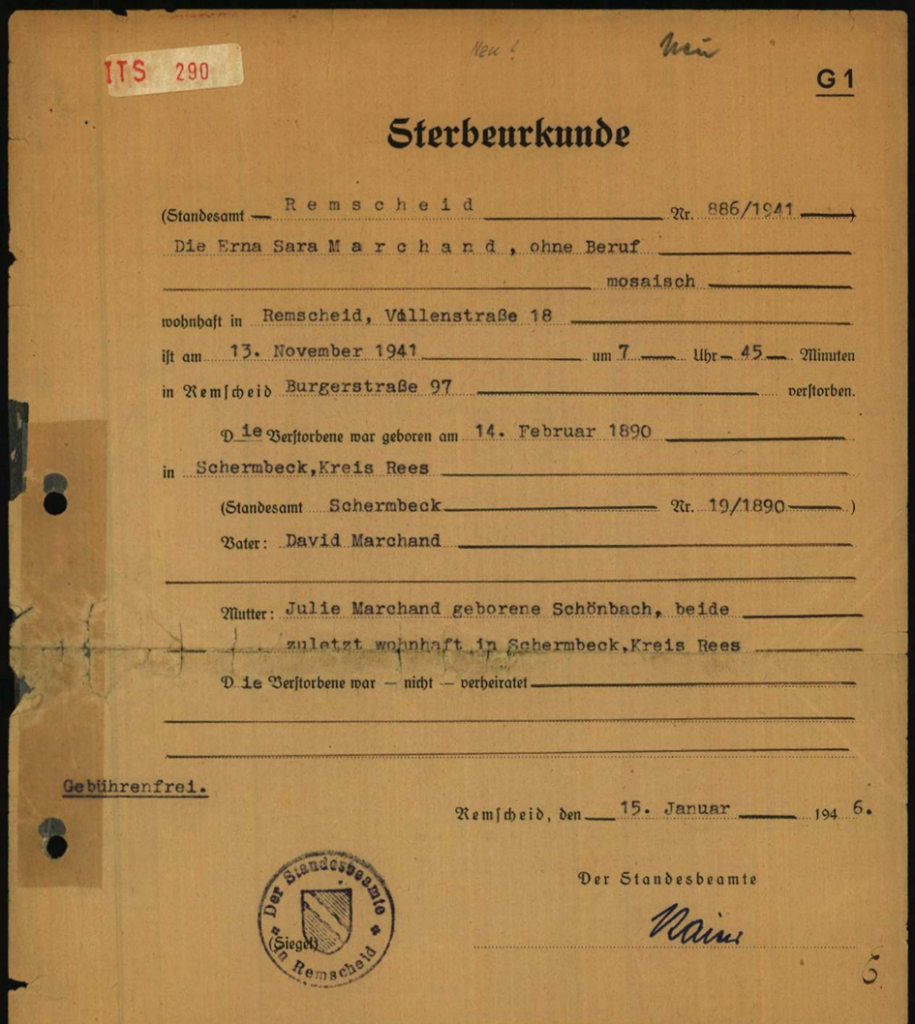 Die Sterbeurkunde benennt aber als Todesort und Zeitpunkt: Remscheid, Burgerstraße 97 (Städtische Klinik), 13.11.1941, so dass sie sich vermutlich dem Transport durch Suizid entzogen hat.