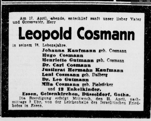 Leopold Cosmann *24.11.1848 in Recklinghausen; ✡17.4.1928 in Essen