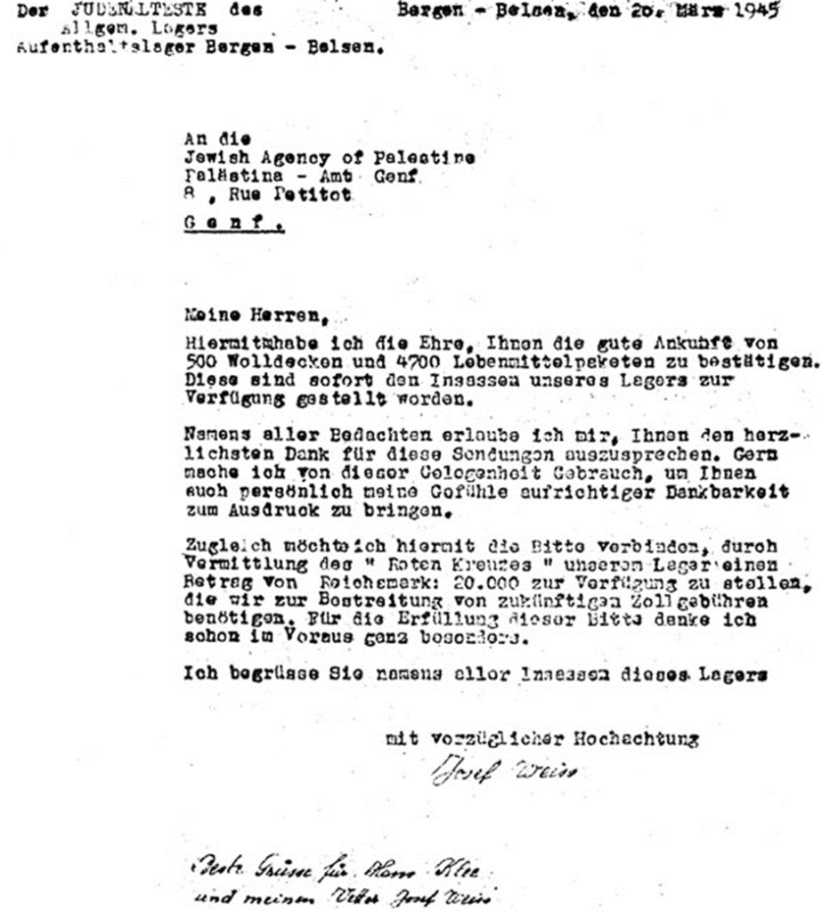 Jupp Weiss an die Jewish Agency in Genf; Leiter war sein Vetter Dr. Josef Weiss – Privatarchiv Zachor/Israel