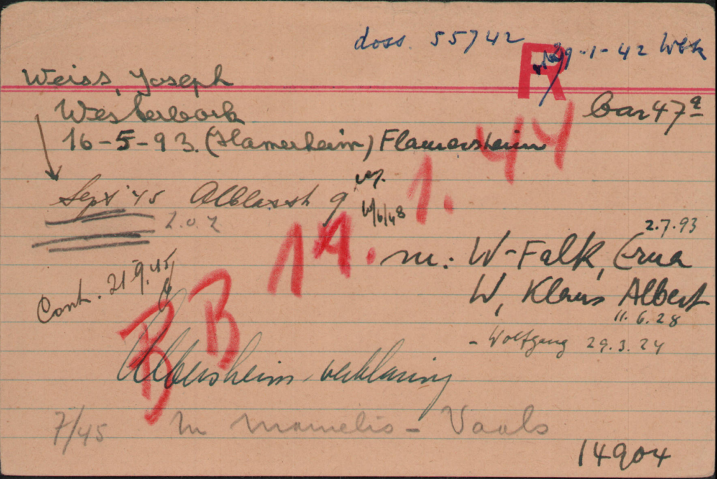 22.12.1944 Jupp Weiss wird Judenältester des Sternlagers, nachdem er zuvor Stellvertreter des bei den Häftlingen verhassten, korrupten griechischen Judenältesten Jacques Albala war. Mit weiteren Häftlingen leitet er die interne Lagerorganisation/Statistik.