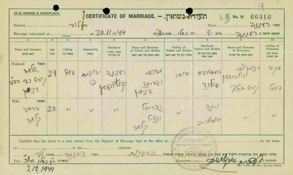 30.11.1944 Heirat in Ra’anana mit Kurt Yigal Erich Benjamin