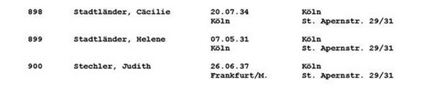 20. 7.1942 Helene und Cäcilie Stadtländer per Zug Da 219 von Köln nach Minsk deportiert, 1.164 Menschen, darunter 118 Kinder aus dem jüdischen Waisenheim St. Apernstraße 29/31;