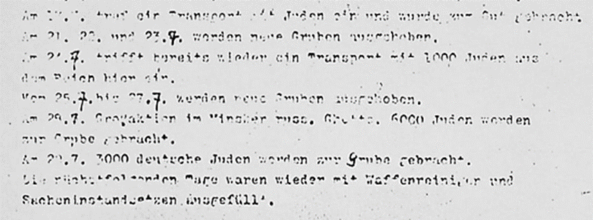 „Am 21., 22. und 23.7. werden neue Gruben ausgehoben. Am 24.7. trifft bereits wieder ein Transport mit 1000 Juden aus dem Reich hier ein. Vom 25.7. bis 27.7. werden neue Gruben ausgehoben. Am 28.7. Großaktion im Minsker russ. Ghetto. 6000 Juden werden zur Grube gebracht. Am 29.7. 3000 deutsche Juden werden zur Grube gebracht. Die nächsten Tage waren wieder mit Waffenreinigen und Sacheninstandsetzen ausgefüllt.“